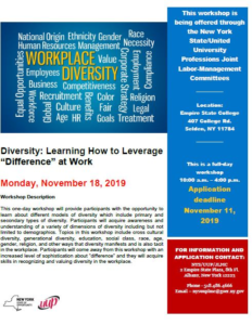 This one-day workshop will provide participants with the opportunity to learn about different models of diversity which include primary and secondary types of diversity. Participants will acquire awareness and understanding of a variety of dimensions of diversity including but not limited to demographics. Topics in this workshop include cross cultural diversity, generational diversity, education, social class, race, age, gender, religion, and other ways that diversity manifests and is also tacit in the workplace. Participants will come away from this workshop with an increased level of sophistication about “difference” and they will acquire skills in recognizing and valuing diversity in the workplace.