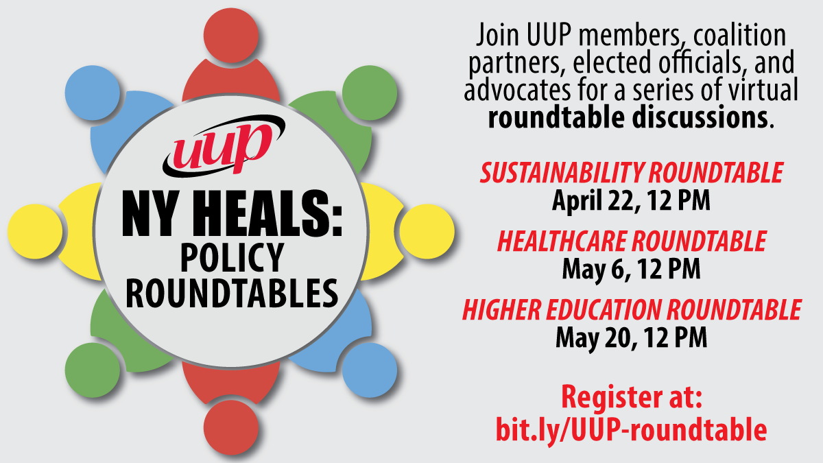 Join UUP in a series of virtual policy roundtables with leading experts, community organizers, coalition partners, and elected officials as we discuss key public policy issues and the role public higher education, you, and your union can play in advancing positive change.