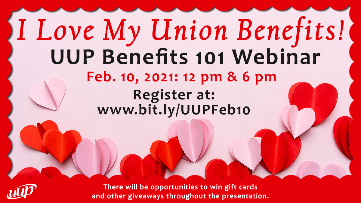 Please join the UUP Benefits Department on February 10 at 12 pm or at 6 pm for a special “I Love my Union Benefits” themed Benefits 101 Webinar. During the webinar, UUP’s Director of Member Benefits Doreen Bango will give you tips for maximizing your benefits. To acknowledge the hard work and dedication of members, there will be many opportunities to win gift cards and other giveaways throughout the presentation.